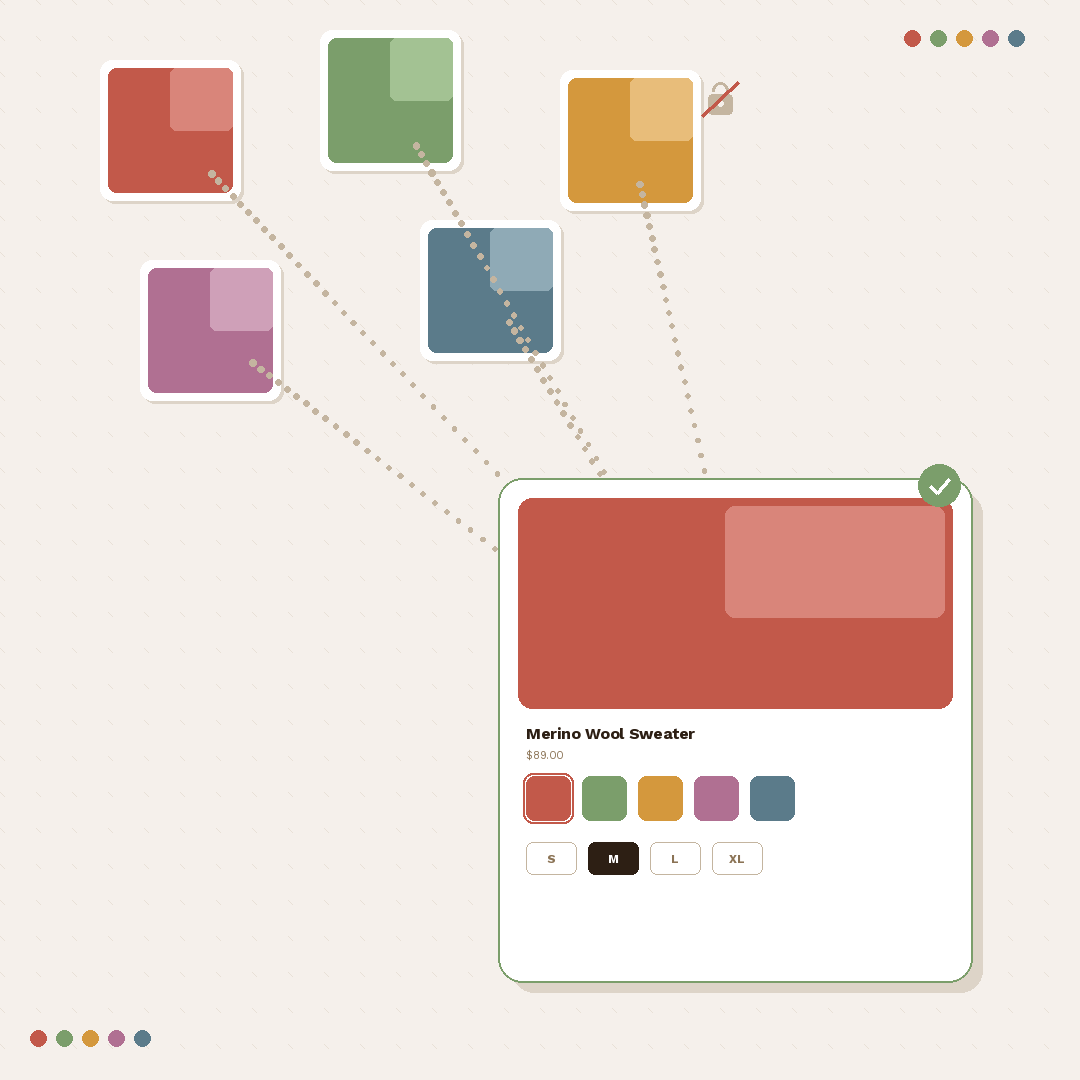 With collection swatches, each blazer shows up as one card with small color dots underneath. Hover over a dot, the card image swaps to show that color. Click it, you go to that product. This is how Zara and H&M display their products, and there’s a reason for that. It works.