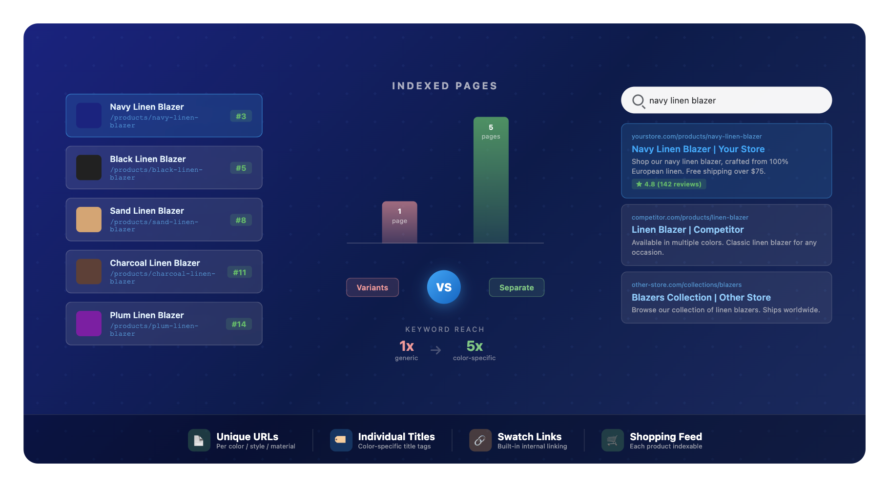SEO matters to your store. This is the one most people overlook. When all your colors are variants under one product, they share a single URL. Google sees one page titled “Linen Blazer.” But when each color is its own product, you get navy-linen-blazer, black-linen-blazer, cream-linen-blazer as separate URLs. Each one can rank independently for color-specific searches. Someone googling “navy linen blazer” is going to click on a page with that exact title before they click on a generic “Linen Blazer” page. We go deeper on the SEO angle of combined listings in a separate post.
